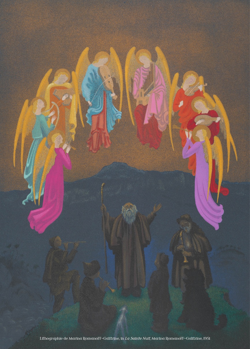 Cette planche est tirée du singulier livre « La Sainte Nuit. Noëls et Légendes en Poèmes », édité à 150 exemplaires en 1951, et principalement dessiné et calligraphié par l’auteure. Fille du grand-duc Pierre Nikolaïevitch de Russie et de son épouse née princesse Militza de Monténégro, Marina Petrovna Romanova de Russie (Nice, 1892-1981) est l’arrière-petite-fille du tsar Nicolas 1er.